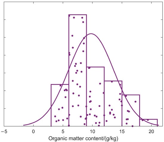 In this article, the 85 soil samples were randomly divided, with 70% of the samples (59 samples) used as the training set and 30% of the samples (26 samples) used as the testing set. The outcomes of the statistical analysis performed on the soil samples are shown in Table 2. The SOM content in the study area ranges from a minimum of 3.68 g/kg to a maximum of 19.40 g/kg, with an average value of 9.77 g/kg. The standard deviation is 3.80 g/kg, and the coefficient of variation is 38.94%, indicating a moderate level of variability. The means of the soil organic matter content in the training and testing samples are 9.68 g/kg and 9.71 g/kg, respectively, with standard deviations of 3.53 g/kg and 3.97 g/kg. The coefficient of variation values for the training and testing samples are 36.56% and 40.54%, respectively, indicating a moderate level of variability. The mean and standard deviation of the organic matter content in the training and testing samples are overall similar, suggesting the feasibility of modeling. Figure 5 illustrates that the SOM content in the study area follows a normal distribution and falls between the ranges of the training and testing samples. This indicates that random partitioning can be used to establish training and testing samples for modeling and provides a solid data foundation for the models developed in this study.