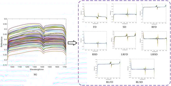 As described in Section 2.2, the soil spectral data in this study underwent several preprocessing steps. Firstly, the original spectral curves were subjected to SG smoothing. Then, several spectral transformations, including FD, SD, RFD, RSD, LRSD, LRSD, RLFD, and RLSD, were used. Figure 7 displays the visible outcomes of these modifications.