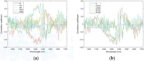 Correlation analysis between organic matter content and different spectral transformation forms. (a) Visualization of spectral correlation coefficients after FD, SD, RFD, and RSD transformations for N. (b) Visualization of spectral correlation coefficients after LRFD, LRSD, RLFD, and RLSD transformations for N.