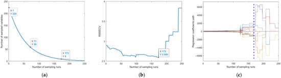 SCARS feature band extraction process. (a) Variable count selection curve. (b) RMSECV change curve for variable selection. (c) Variable selection coefficient change curve. (Each line represents a regression path, and '*' indicates convergence at this point).