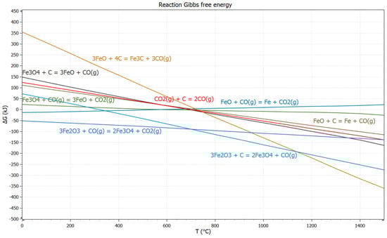 Reduction of iron oxides is one of the most important processes that takes place in reduction reactors (for example, Blast Furnace, Midrex, Corex, etc.). Reduction by carbon is referred to as direct reduction, while indirect reduction is the reduction by gases, for example, carbon monoxide. The stability of individual iron oxides, i.e., Fe2O3, Fe3O4, and FeO, is not identical. Out of all iron oxides, Fe2O3 exhibits the lowest stability. When heated to 1360–1370 °C, it undergoes thermal dissociation without the involvement of a reducing agent in the air, while intensive dissociation occurs at a temperature of approximately 1450 °C. The reduction process requires excessive amounts of reducing agents because the reactions of reduction of ferric oxide (Fe2O3) to ferrous oxide (FeO) and reduction of ferrous oxide (FeO) to iron (Fe) are reversible in certain conditions; this means that Fe and FeO easily oxidise in the CO2 environment. The reaction of reduction of Fe2O3 to Fe3O4 is irreversible; this means that excessive amounts of a reducing agent are not required, and ferric oxide does not oxidise in the CO2 atmosphere. Figure 1 shows the feasibility of individual reduction reactions, indicating that the production of iron by reduction using carbon is thermodynamically feasible at temperatures of ~700 °C. With an increasing temperature, the carbothermic reduction will be more effective with a higher degree of metallisation. In addition to iron produced by the reduction, a sequence of several reduction reactions results in the formation of carbides (e.g., Fe3C); at temperatures of ~800–1100 °C and in the presence of silica, hematite may reduce to ferrosilicon.