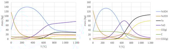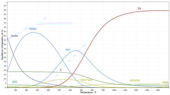 Thermodynamic modelling of conditions for the reduction of iron ore using a solid charcoal-based reducing agent was the subject of the subsequent research. The key objective was to create computer simulations of chemical reactions using the HSC Chemistry thermodynamics software [26]. Thermodynamic data were obtained from the software HSC Chemistry (HSC: H, enthalpy; S, entropy; C, heat capacity). HSC Chemistry offers powerful calculation methods for studying the effects of different variables on the chemical system at equilibrium. The aim is to obtain the simplest approach (using this software to calculate equilibrium) that allows one to predict the output parameters (amounts, chemistry, mineralogical composition, and total heat) based on the initial composition analysis. Thermochemical calculations are based on enthalpy (H), entropy (S), heat capacity (Cp), or Gibbs energy (G) values for chemical species. Thermodynamic simulations facilitated predicting the output parameters of direct reduction iron (DRI) products based on the baseline composition of the materials.