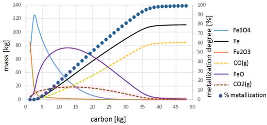 A step that was necessary in order to perform high-temperature experiments with the analysed commodity was, in addition to identifying its chemical and mineralogical composition, to perform a thermodynamic analysis and define reduction conditions. Those tasks were based on the results obtained by analyses of ores and on a known reducing agent. In our research, we used high-quality charcoal. The effects of a temperature on the reduction process at two predicted levels of carbon consumption per 1 mole of Fe2O3 indicated that it was necessary to use the highest amount of the reducing agent in order to achieve a high degree of metallisation (Figure 2 and Figure 3). With an insufficient amount of the carbon reducing agent, the system contains a high amount of FeO, whereas with an excessive amount of the reducing agent, the quantity of carbides (e.g., Fe3C) increases. Apparently, a temperature of 1200 °C is sufficient to achieve high degrees of metallisation. An optimal content of a carbon reducing agent should be approximately 35–40%. A real mineralogical composition of the ore and a real composition of a reducing agent (e.g., volatile components and ash) will affect the course of the desired metallisation.