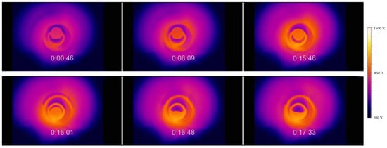 Subsequently, a sample of Rudomain iron ore was subjected to tests of thermal stability in the process of oxidation and reduction in an electric resistance furnace with the use of IR thermography scanning with a high-temperature camera (TIM, Micro-Epsilon, Ortenburg, Germany). The recorded stability of the raw pellet within the interval of reduction temperatures was used to identify the maximum temperature of reduction tests in the solid state (Figure 4).
