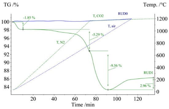Based on the aforementioned results, the Rudomain sample was subjected to thermal stress in the mode of linear heating up to 1200 °C in the air atmosphere (RUD0); another analysed sample was a mixture of Rudomain iron ore and a solid reducing agent (coke) in a ratio of 5:1 (RUD1) in the combined conditions of nitrogen atmosphere during the linear heating up to 1200 °C, while in the second phase, it was in the CO2 atmosphere at the isothermal holding at the given temperature for the period of ~60 min. Coke (83% carbon; 12% ash; 5% volatile combustible substance) was selected as a reducing agent to be used in a TGA analysis only. The solid green line shows the mass loss, and the dashed green and blue lines show the increase in temperature. The TG curve (Figure 5) for the iron ore in the given conditions confirmed its thermal stability at temperatures of up to 1200 °C. The ore+reducing agent sample exhibited a two-step mass loss during the linear heating process. The first step corresponded to the moisture in the preparation of the sample mixture, while the second step of decomposition was associated with the maximum values of DTG at 663 °C and 1136 °C, which steadily continued after the atmosphere changed. A mass loss of ~5% corresponded to releasing a residual amount of the volatile combustible substance of coke (still in the N2 atmosphere stage) and steadily continued, with higher intensity, in the CO2 atmosphere also. The CO2 present above the sample in this temperature interval reacted with the carbon reducing agent to form the reduction component CO. The mass loss of the mixture sample, caused by degradation of the carbon-based fuel as well as the reduction of iron ore oxides, corresponded to the phase of isotheral heating. The last phase of ~3% mass gain is probably related to the potential oxidisation of the reduced portion of iron with CO2.