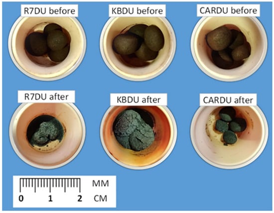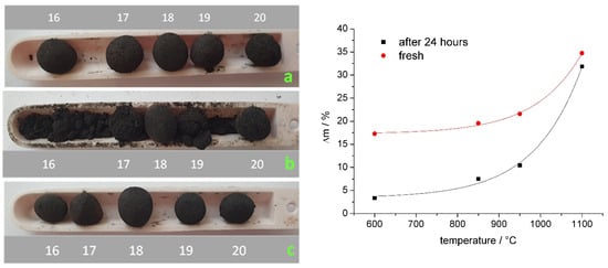 The testing of stability of pellets containing Rudomain and a solid charcoal reducing agent (R7DU) in a thermal shock was carried out with fresh and non-fresh (left in the air for 24 h) samples at 4 different temperatures (600 °C; 850 °C; 950 °C; 1100 °C) and a holding time of 10 min. At temperatures below 850 °C, the pellets exhibited thermal stability and remained undisturbed from the macroscopic point of view. Non-fresh pellets exhibited higher shock resistance than fresh pellets since at 950 °C, they exhibited only cracks without further degradation. At a temperature of 950 °C, fresh pellets partially disintegrated (Figure 6). In the right section, the figure shows the differences in the mass loss of pellets following a thermal shock relative to a temperature.