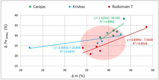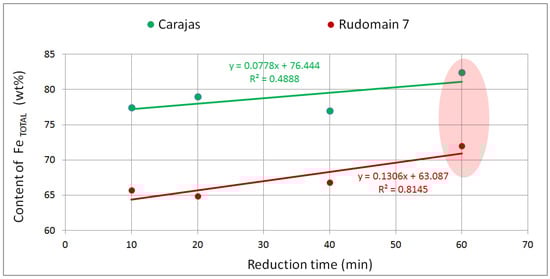 The high-temperature reduction of iron ores was carried out in two stages. The first stage comprised experiments conducted in a Marsh resistance furnace and in a chamber resistance furnace, followed by experiments in an electric induction furnace. During the experiments in the resistance furnace, a correlation between the changes in the mass and the changes in FeTOTAL content in the samples of metallised pellets was examined. A mass loss of Krivbas amounted to 22–42 wt%; for Rudomain, it was 34–48 wt%; and for Carajas, the total loss ranged in the interval from 38 to 43 wt%. The results of the identification of effects of reduction time on a FeTOTAL content and ΔFeTOTAL in the samples of metallised pellets revealed a linear correlation for Carajas and Rudomain samples, as shown in Figure 7. As for Krivbas, the maximum values were achieved after 20 min. Similarly, in the study [21], it is clear that with increase in temperature of the reduction of the Fe ores, the percentage of reduction increased with the increase in time. In the metallisation process, it was observed that there is a rather strong correlation between the changes in the mass and the changes in FeTOTAL content in the samples of metallised pellets, as shown in Figure 8.