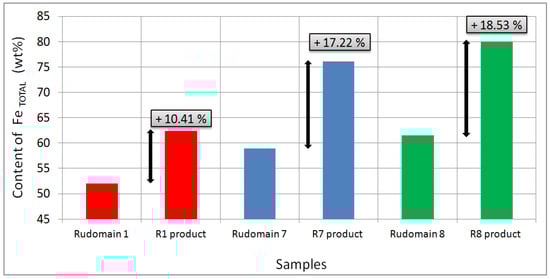 Increased FeTOTAL contents after the reduction of Rudomain iron ore samples (temperature = 1200 °C; reduction time = 60 min.; N2 inert atmosphere).