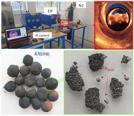 In the following stage, experiments with carbothermic reduction of Rudomain ore (the average-representing R7 sample) were performed in an electric induction furnace (EIF) (Figure 11). The results of the reduction in EIF showed that the achieved results of metallisation were not as positive as those achieved with a Marsh furnace (MF). In the experiments, the inert gas used was nitrogen (N2) in order to utilize the reduction potential of the solid reductant. The highest FeTOTAL content was achieved in the experiments conducted in EIF, namely 72.04%, which corresponded to the reduction degree of 79.3%. One of the reasons the pellets inside the steel tube buried in the silica retort were reduced unevenly is the static layer in which they were placed. The static layer facilitated neither the even exposure of its surface to the inert nor the removal of oxygen in form of a reaction product, namely CO. The reduction process was also affected by the disintegration of some of the pellets in the process and by the layered localisation of the individual pellets in the tube.