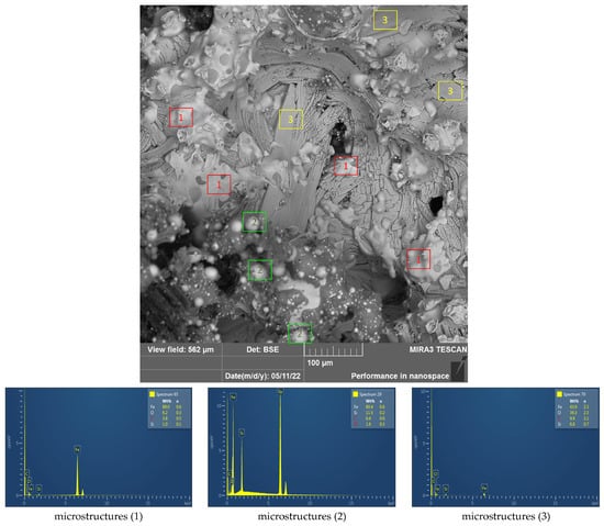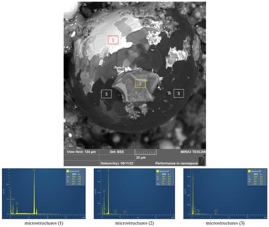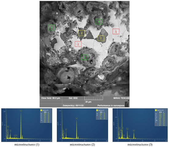 A subsequent microscopic EDX analysis carried out using the Tescan MIRA3 microscope confirmed that there were differences between the quality of DRI 1 (the best product of metallisation in optimal reduction conditions in the Marsh resistance furnace) and the quality of DRI 3 (the product of metallisation in the electric induction furnace) metallised pellets. The microstructure of DRI 1 contained a significantly higher amount of grains formed by the reduction than those observed in DRI 3 pellets produced in EIF. Major parts of the DRI 1 sample consisted of continuous formed areas of metallic iron, low-carbon iron carbide (Fe2C0.05), and ferrosilicon with a low silica content (Fe3Si). The microstructure of the DRI 1 sample was observed to also contain cristobalite (SiO2) located on the surface of the iron areas formed by the reduction. Cristobalite is a high-temperature form of the original silica contained in the Rudomain ore. The microstructure also contained the signs of the reduction mechanism, in particular continuous zones of iron produced by reduction on the original hematite grains. Melted iron grains with residual carbon were also observed as well as the melt with a fayalite-like structure (2FeO.SiO2), and these were reformed in the reduction process into spheres of metallic iron and ferrosilicon with a low content of silica (Fe3Si) (Figure 12). The microstructure of Fe and Fe3Si produced by the reduction also contained zones with complex oxide compounds based on Fe–Ca–Si, probably formed of hedenbergite CaFe(SiO3)2. Oxides of calcium originated from the ash contained in the charcoal reducing agent, while the major component was CaO-based. A detailed image (Figure 13) facilitates the identification of a regular crystalline structure of iron and ferrosilicon with a low content of silica (Fe3Si) produced by the reduction, and on their surface, there are complex oxide compounds based on Fe–Ca–Mg–Si, which were probably formed as a result of reactions between the charcoal ash and the original hematite grains. Similarly, in the study [17], some ferrous oxides contained elements such as Mg and Ca. The study identified higher contents of Ca, Si oxides, and trace amount of Fe and P. After reduction in the samples, porous elements of almost pure Fe and darker segments of Ca and Si oxides were identified [17].