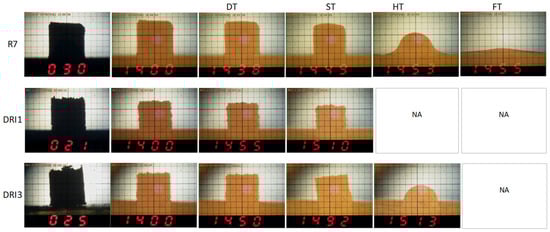 High-temperature observation of DRI 1 and DRI 3 iron ore samples before (R10) and after metallisation. NA—not analyzed at higher temperatures due to temperature limit reached, maximum about 1515 °C.