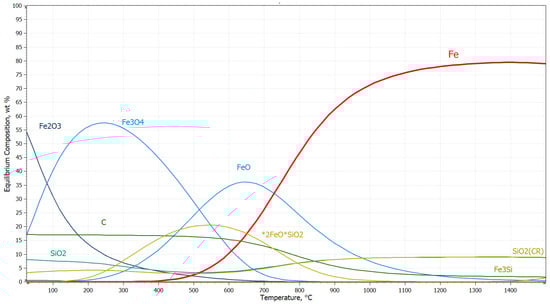 With the samples of Rudomain iron ore, it is possible to apply an uncomplicated technological operation in order to increase their richness (FeTOTAL) by ~3–5 wt%, in particular by separating approximately 14% of the largest fractions (above 5 mm). Thicker fractions (above 5 mm) may be further treated to obtain grains containing mostly hematite (above 90%); alternatively, this product may be used for sale (for example, for the production of Portland cement, ceramics, for water treatment, stabilisers, etc.). If this fraction was used for metallisation at a higher temperature of 1400 °C (or if Rudomain iron ore is enriched to ~65 wt% of FeTOTAL), it would be possible to produce a metallised DRI product with a following chemical composition: FeTOTAL 90%; SiO2 8% (silica 4% + cristobalite 4%); C 1.8%; and other components representing 0.2%. Figure 17 shows a predicted equilibrium composition in the metallisation of the enriched Rudomain iron ore.