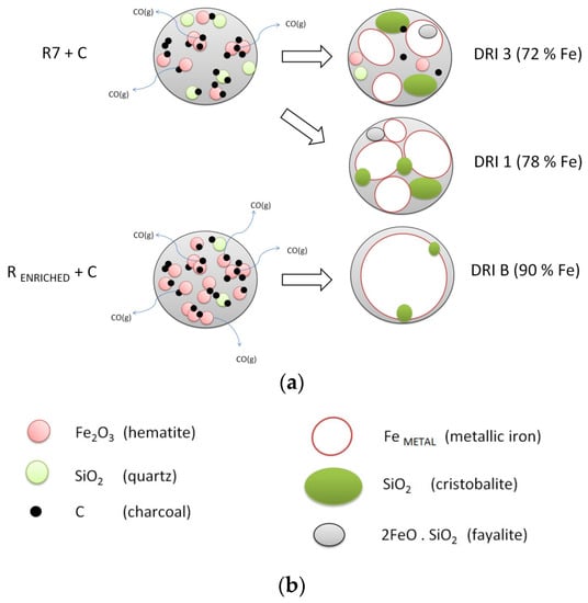 Schematic comparison of the reduction of Rudomain iron ores. (a) schematic illustration of Rudomain ore reduction, (b) legend to schematic illustration. (R7 + C) Input Rudomain ore R7 + reducing agent (charcoal). (RENRICHED + C) Input enriched Rudomain + reducing agent (charcoal). (DRI 3) An insufficiently reduced DRI pellet made of Rudomain R7. (DRI 1) An excellently reduced DRI pellet made of Rudomain R7. (DRI B) A prediction of an excellently reduced DRI pellet made of enriched Rudomain ore.
