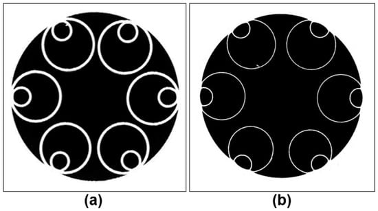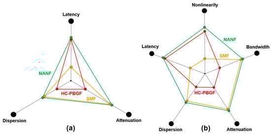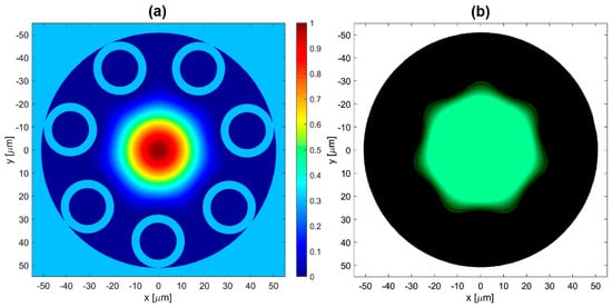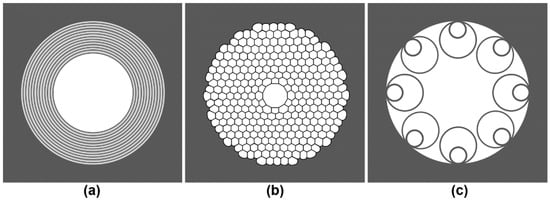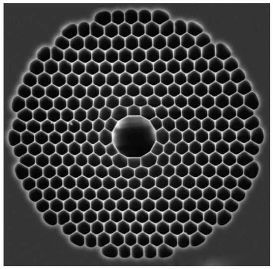 HC-PBGF fibers (Figure 1b) have a photonic barrier exhibiting periodic variation in the refractive index, made of multiple concentric layers of identical, usually hexagonal, gas-filled cells, sometimes called a “photonic crystal”, because of regularly repeating units and their directional arrangement. The typical number of layers is 6–9. All solid parts of this fiber are made of the same material.
