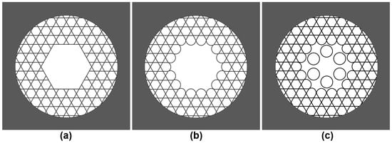 Photonic bandgap fibers with regular photonic cladding support the propagation of higher-order modes, while telecom networks require single-mode fibers. Single-mode propagation can be ensured with “shunts”—hollow cavities larger than normal cells of the photonic structure, but smaller than the core (Figure 5). In the OFS fibers shown in Figure 5b,c [21], the core and shunt have cross-sections equal to 19 cells and 7 cells, respectively.