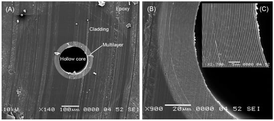 Figure 3. HCF with a Bragg reflector made of 74 alternating layers of PEI polymer, seen as grey (each 0.47 μm thick), and arsenic triselenide, seen as white (each 0.27 μm thick). The cladding had a 684 μm outer diameter and was made of PES polymer. (A) complete fiber, (B) Bragg reflector, (C) layers of Bragg reflector. This fiber had a fundamental photonic bandgap at 2.28 μm. Reproduced from [15]. - The materials of the Bragg reflector and cladding (jacket) shall have similar melting temperatures and melt viscosities to allow fiber drawing.