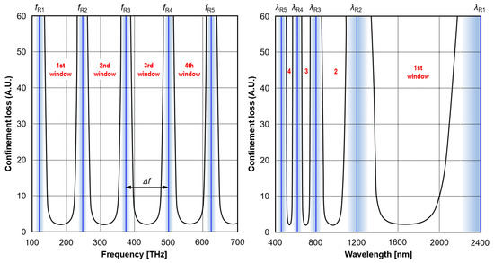 Low-loss bandwidth of HC-PBGF can be considerably reduced via interference from lossy surface modes localized at the core–cladding interface; these modes can anti-cross with air-guided modes, giving rise to narrow spectral regions of high loss [11]. Examples of loss spectra are shown in Section 4.1.