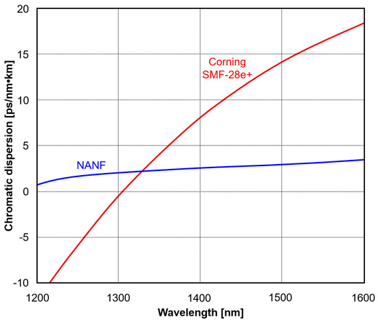 Another special property of HC-PBGFs is the characteristic of chromatic dispersion (CD), shown in Figure 8 for OFS AccuCore fiber [22]. Both the CD and CD slopes rapidly increase close to the edges of the transmission band, and the sign of CD is reversed in the middle. As a result, high bit rate transmissions in a part of the low-loss band may require dispersion compensation, which adds undesirable latency.