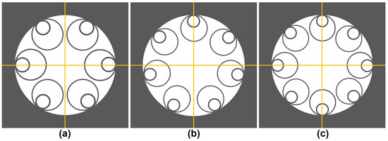Evolution of HC-PBGF to ensure single-mode operation: (a) early design without shunts (Blaze Photonics HC-1550-02); (b) OFS single-mode fiber with two shunts [20]; (c) OFS AccuCore improved single-mode fiber with six shunts [21,28].