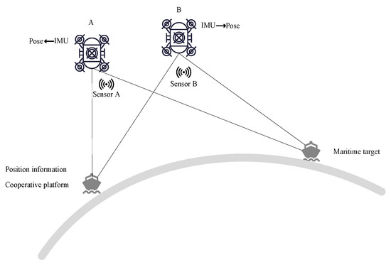 The mutual observation information among UAVs is obtained by approximating the observation information of UAVs on a cooperative platform. The cooperative platform is treated as a fusion center. The positions of the UAVs, the cooperative platform, and the maritime target are unified into a local geographic reference system under the fusion center.