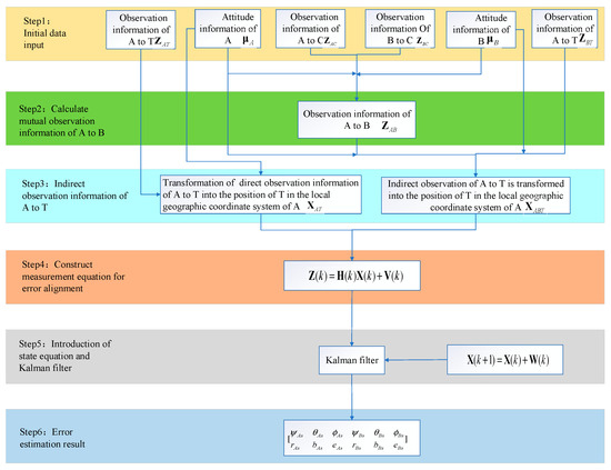 According to the estimated systematic error in Equation (28), the systematic error in Equations (1)–(6) is reduced to obtain the observation information of UAVs A and B to the cooperative platform and the sea target T at the moment k, which are denoted as , , , . The attitude information of the platforms after inertial guidance compensation is and , respectively. The above has completed the estimation of sensor observation errors and platform attitude errors, and then the data are aligned and compensated. Next, we move to the tracking of the target at sea.