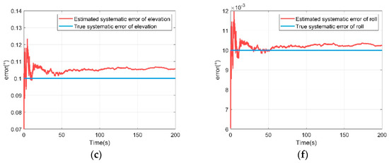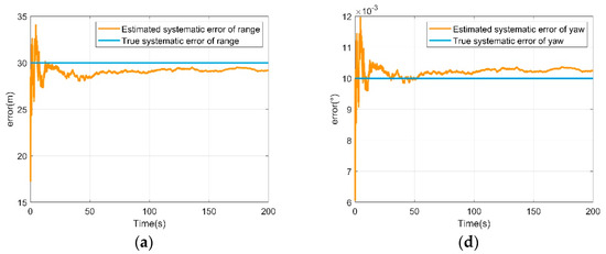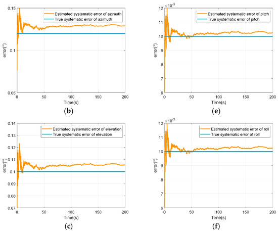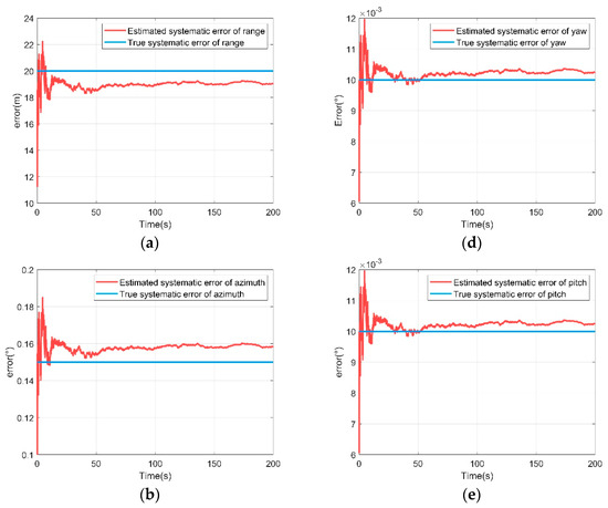Systematic error estimation of UAV B. (a) Range systematic error estimation of UAV B; (b) azimuth systematic error estimation of UAV B; (c) elevation systematic error estimation of UAV B; (d) yaw systematic error estimation of UAV B; (e) pitch systematic error estimation of UAV B; (f) roll systematic error estimation of UAV B.