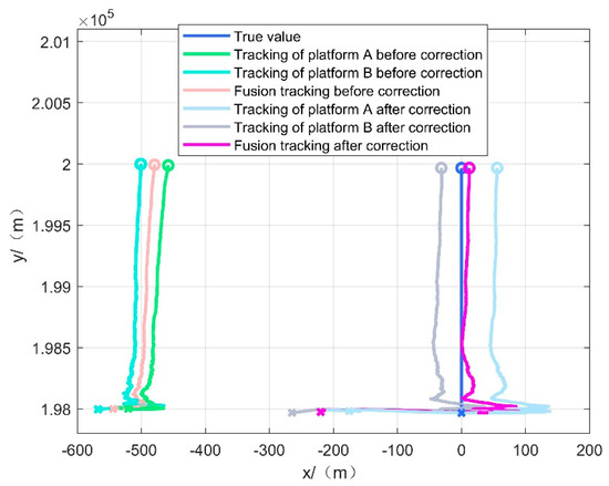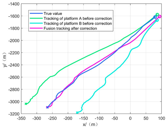 As shown in Figure 6 and Table 4, the corrected single-platform and multi-platform fusion tracking effects are better than that of the uncorrected single-platform and multi-platform fusion. Due to sensor systematic errors and attitude systematic errors, the uncorrected tracking trajectories all deviate from the true value of the target motion trajectory, while the corrected single-platform tracking effect has been improved compared with the uncorrected one. However, there are still some deviations due to the coordinate transformation error and error estimation error, and the tracking accuracy is further improved by the fusion of the unified coordinate system of the cooperative platform. Figure 6 shows that the corrected tracking effect has a large jitter in the initial stage, and the relatively large error is due to the fact that the initial error estimation stage is not converged and the systematic error estimation deviation is large, resulting in the corrected data also deviating from the true value in the initial stage, but after the systematic error estimation is converged, a stable and accurate tracking of the target is quickly maintained.