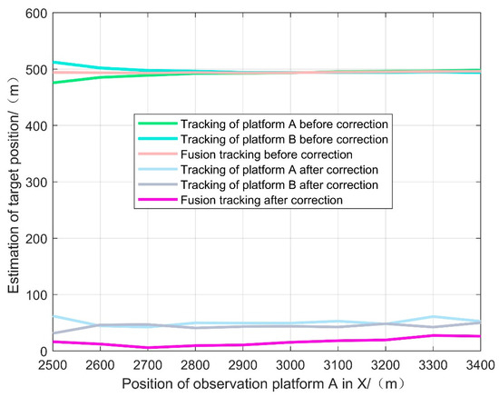 To further illustrate the effectiveness of the proposed method, the positions of the observation platforms are changed, and UAVs A and B are set to move 900 m in the X direction, and the tracking effect at different observation positions is shown in Figure 7.