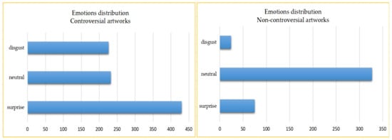 Since the concept of controversial and non-controversial artworks was fundamental to this context, identifying the most popular works in each category was not the sole objective of this study. In addition, it intends to investigate the emotions elicited by these works in their viewers and analyzes these emotions through text processing of Instagram posts referencing these works. Art can have a significant impact on an individual’s emotional state, inducing either positive or negative emotions, according to a review of the relevant literature. With very few exceptions, art receives no response from viewers. In fact, both the literature and the experiments demonstrate that the context and inherent qualities of art objects can affect an individual’s aesthetic experience and engagement. Therefore, the text of the posts was kept in the same order as that of the other datasets so that it would be simpler to analyze and assign emotions using the annotated method and the SMART tool discussed in a previous section. Most studies evaluate emotions using the VADER lexicon from the NLTK tool, which categorizes emotions as positive, negative, or neutral. This procedure, however, does not meet the requirements of the research topic. For this purpose, we selected the emotions of disgust and surprise, as mentioned below. The posts that express no other emotion were marked as neutral.