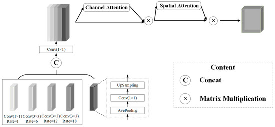 The DCPA module, inspired by [11,33], is detailed in Table 1 and visualized in Figure 2. The module comprised the parallel dilated convolution blocks (PDCB), which consisted of multi-scale parallel convolution layers with different dilation rates, along with a global pooling layer. The dilated rates used in four parallel paths were 1, 6, 12, 18, respectively, aiming to capture pyramid features and context information of road pixels. The output of the parallel paths was then concatenated and processed by a 1 × 1 convolution layer to produce the final output. The dilated convolution layers control the size of the effective receptive field of the convoluted kernels and dilated rate. A larger dilated rate corresponds to a larger scale without reducing feature resolution. Furthermore, the global pooling layer, which operates at the image level, averaged the feature maps across the spatial dimensions to improve the model’s ability to recognize global context and capture long-range dependencies. Furthermore, each path in the DCPA module consisted of a convolution layer with a specific dilated rate, followed by the operations of batch normalization (BN) and activation (ReLU).