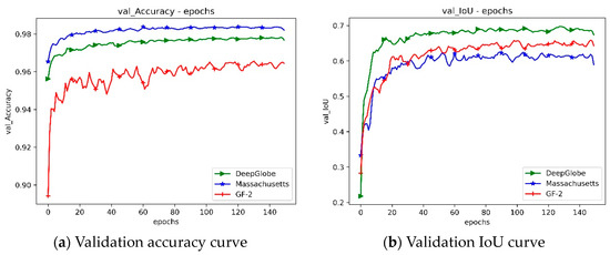 Figure 4 exhibits the accuracy and IoU curves of the DPBFN from three validation sets. From the leftmost graph, it can be observed that the accuracy of all three datasets start stabilizing after 20 epochs. The Massachusetts dataset achieves the highest accuracy. The accuracy of the Massachusetts and Deep Globe datasets remains relatively stable, while that the GF-2 dataset exhibits more significant fluctuations. However, as shown in Figure 4b, the Deep Globe dataset achieves the best IoU. The IoU curves of the Massachusetts and GF-2 datasets exhibit a phenomenon of crossing during the convergence process, especially in the beginning of 10 epochs. Moreover, even after reaching a stable state, the IoU value of GF-2 is higher than that of the Massachusetts dataset.