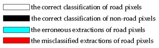 The road networks are commonly evaluated by complexness and correctness [19]. Because the metrics mentioned above can be approximated as precision and recall, the extracted road results are evaluated by the overall accuracy (OA), precision (P), recall (R), F1, and intersection-over-union (IoU). The F1 score and IoU serve as two comprehensive evaluation metrics. These metrics [34] can be computed as follows: