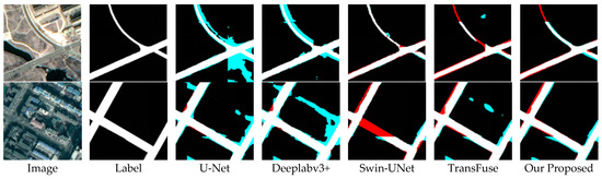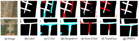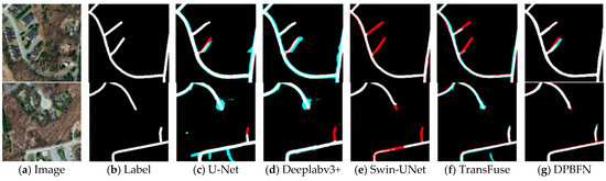 We mainly validate the performance of our network with other different road extraction methods through the three challenging datasets mentioned above. These datasets are optical remote sensing imagery datasets. To demonstrate the advantages of the DPBFN, we compare our method with some classic methods selected from CNN-based, transformer-based, and hybrid based. To facilitate visual interpretation and the analysis of extraction outcomes yielded by diverse algorithms, accurately classified road segments are represented in white, while accurately classified non-road pixels are depicted in black. In cases of erroneous extractions and misclassified pixels, these specific segments will be emphasized by using red and blue shades, as illustrated in Figure 5.