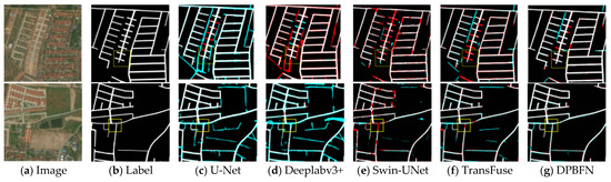 The statistical analysis of Table 5 shows that the overall accuracy of the DPBFN is higher than that of the other methods. Our method shows that the classification accuracy of the two shown images is the highest, with an average OA of 96.57% and an average IoU of 96.11%. U-Net holds the last classification rank, with an average OA of 92.62% and an average IoU of 91.52%. The rest of the network performance is between the two, the second models are TransFuse and Swin-UNet, the average OA is 95.89% and 95.33%, respectively, and the average IOU is 95.39% and 95.35%, respectively. Although the DPBFN has achieved better results, the fracture and mis-extraction of rural road extraction results will be more obvious than in urban roads.