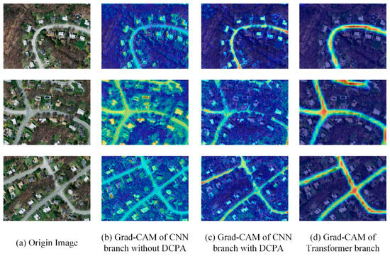 The higher-level visual constructs [38] and global context information [39] play significant roles in road extraction from HR remote sensing imagery with complex background. In terms of HR remote sensing images interpretation, it is vital to explain the effectiveness of the extracted method. The class activation map (CAM) is a widely adopted and efficacious approach for interpretation in various domains. Thus, we utilize Grad-CAM [40] generated class activation maps with gradient information, as shown in Figure 11. It leverages the gradient information flowing into the last convolutional layer of both branches to assign importance value to each neuron for a particular decision of interest [40].