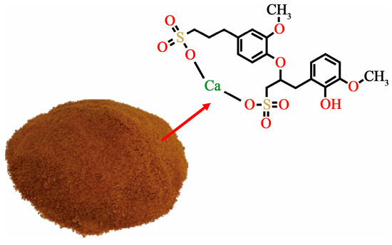 A CLI-type polymer active agent (CLI) was selected for this study (Figure 1). CLI is prepared by purifying and drying paper-making wastewater and is a brownish-yellow powder at room temperature. CLI contains a large number of calcium ions, and the molecular side chain has many sulfonate groups that have strong adhesive properties. Meanwhile, due to the presence of anionic groups (sulfonate and hydroxyl), CLI is water-soluble and ion-exchangeable in solution. In addition, CLI can be used as a binder for poultry and livestock feeds to reduce the content of fine powder and the dust recovery rate. Moreover, CLI is environmentally friendly during soil improvement.