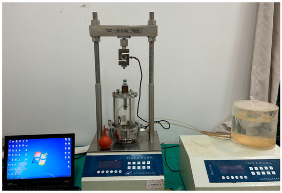 The confining pressures in the triaxial shear tests were 100 kPa, 200 kPa, and 300 kPa, respectively. The experimental process used the Chinese standard (GB/T 50123-2019) [41], and the strain rate of the triaxial shear equipment was controlled at 0.8 mm/min. The test procedure was as follows: (1) After the latex film passes through the tube, the two ends of the film are turned out and fastened to the mouth of the tube, and the gas is sucked out through the air holes with the use of an aurilave, so that the latex film is tightly attached to the inner wall of the tube to ensure that the sample can be placed in the tube. (2) Release the aurilave after placing the sample in the film-bearing cylinder so that the latex film can tightly adhere to the sample. (3) Transfer the sample to the pressure chamber, fill the pressure chamber with water and then close the air vent, set the appropriate confining pressure, and start the test. According to the test, if the axial force reading does not have a significant reduction, the deviatoric stress from shearing to the time when the axial strain reaches 15% is defined as the peak deviatoric stress. The instrument used in the experiment was a TSZ-1 full-automatic triaxial shear equipment (Figure 2), which was made by Nanjing soil Instrument Factory.
