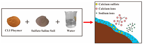 Schematic illustration of the CLI polymer reacting with sulfate saline soil to produce calcium sulfate precipitation.