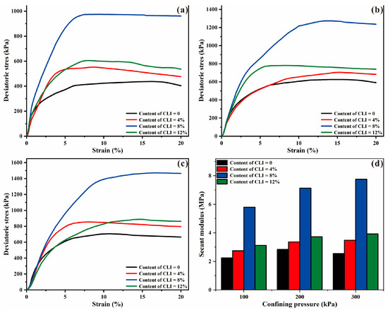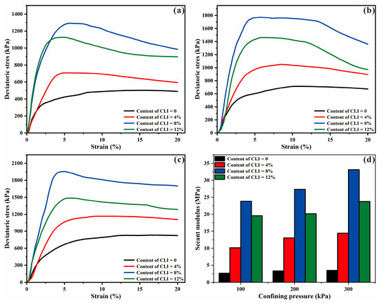 Figure 4d shows the effect of CLI content and confining pressure on the secant modulus, in which the secant modulus was defined as the ratio of the peak deviatoric stress to the corresponding axial strain. In general, the secant modulus increased with confining pressure. The secant modulus increased as the content of CLI increased from 0 to 8%, which showed improvements of about 2–3 folds. As the content of CLI increased to 12%, the secant modulus decreased but was still higher than that of 4% CLI.