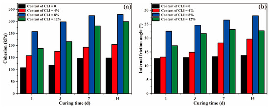 Figure 6b reveals that the trend of the internal friction angle with the content of CLI and curing time was similar to that of cohesion. As shown in Figure 6b, the internal friction angle increased first and decreased with the content of CLI. When the content of CLI was 8%, the internal friction angle reached the peak value, which was about 2 times that of the non-modified samples after different curing times (1, 3, 7, 14 days). For the non-modified samples, the effect of curing time on the internal friction angle was marginal. It increased by 0.36–1.11° as the curing time increased from 1 day to 14 days. Moreover, with the increase in the curing time, the effect of different contents of CLI on the internal friction angle was more significant. It can be seen that the internal friction angle of the samples after curing for 14 days was enhanced compared to that of the samples cured for 1 day by about 49.16% (content of CLI = 4%), 24.74% (content of CLI = 8%), and 31.24% (content of CLI = 12%), respectively.