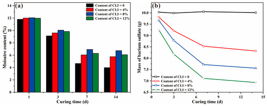 Changes in the moisture content of samples and mass of barium sulfate in samples with different CLI contents and curing times: (a) moisture content of samples; (b) mass of barium sulfate in samples.