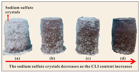 Precipitation of sodium sulfate crystals from the surface of treated sulfate saline soil after curing for 14 days: (a) Content of CLI is 0%; (b) Content of CLI is 4%; (c) Content of CLI is 8%; (d) Content of CLI is 12%.