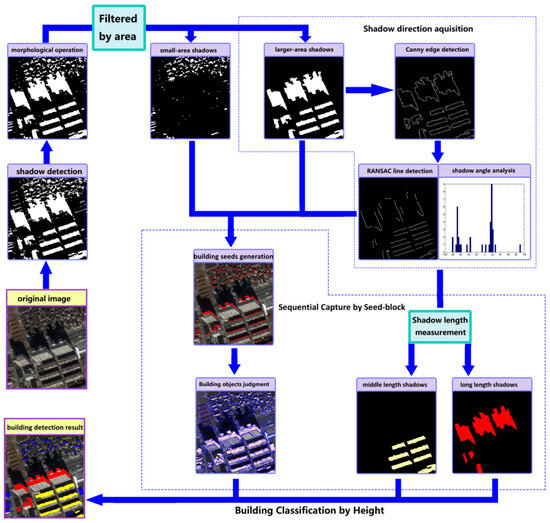 The aim of this paper is to fully mine shadow information to detect and classify buildings according to height level in an urban high-resolution image with large-area shadows. The key steps in this process are introduced in this section, including shadow obtaining, shadow direction acquisition, building detection, and height classification. A flowchart of our method is shown in Figure 2.