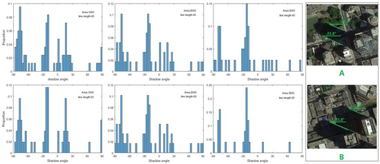 Because the high-rise building shadows most likely exhibit shadow angles with long straight lines, here, two typical and effective algorithms were introduced to find these line features: the Canny edge detector [36] and random sample consensus (RANSAC) [37]. We detected shadow edges on SHc with the Canny edge detector, and the result was recorded as EG. After Canny edge detection, each connected domain in EG was set as a unit. We used RANSAC to detect inliers in every unit. The inliers are the points that can be fitted to the line, and the outliers are the points not on the line. Next, we set the length thresholds of the line. Empirically, we set two length thresholds according to the resolution and shadow size, recorded as L1 and L2. Figure 3 shows the results of different area thresholds and different lengths of lines. At last, we count the number of lines at each angle obtained by RANSAC for different area thresholds and for different lengths of lines, as shown in the histograms in Figure 4. We sum up the proportions in every case; the angle that has the largest value is the shadow angle θ.