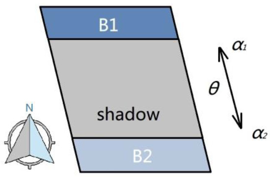 In Equation (3), is the average gray value of , and is the average gray value of . In Equation (4), shadow direction is and . In Equation (5), N represents all the shadows involved in the calculations. In theory, it is unlikely that M = N/2. If M = N/2, obtain another area threshold and repeat this step. Lastly, a manual sampling check is applied in the event that an extreme case occurs; for example, if θ equals 0.