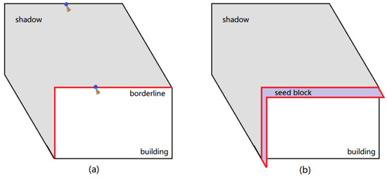 In Figure 6a, the blue line has a direction opposite to the shadow direction, and the orange sector region is blue-line-centered and 5° on both sides. There is a one-to-one correspondence sector region for the points on the shadow edges. The sector regions are examined to detect the borderlines. If the entire sector region is out of the shadow region, the corresponding shadow edge point is regarded as the borderline between shadows and buildings. If the sector region partially falls into the shadow region, the corresponding edge point is regarded as a normal edge point and is left out. In Figure 6b, the points on the borderline between a shadow and a building are shifted slightly in the direction opposite of the shadow. The seed-block is composed of that area that is circled by the shifted line and the original borderline. It is located along the edge between the shadow and the building.