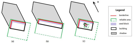 According to the shadow direction and the borderline between a building and its shadow, a reliable area is generated using the following rules. The diagrams for each rule are shown in Figure 7.