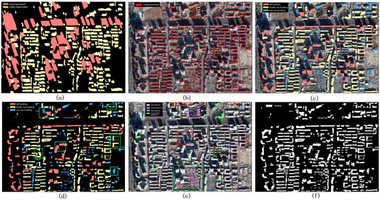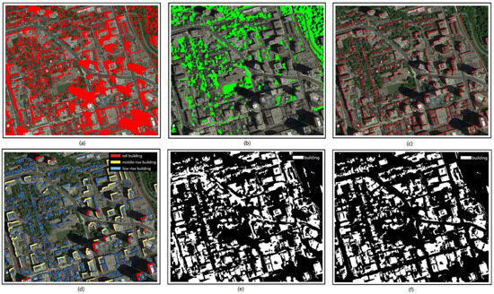 Steps and results for the building detection and height-classification method: (a) shadow detection result; (b) vegetation detection result; (c) result of seed-block generation; (d) building detection and height-classification result; (e) binary result of building detection with RF; (f) binary result of building detection after road removal.