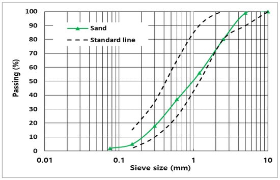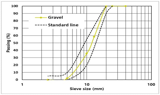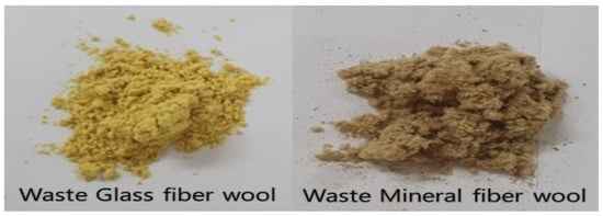 In this study, Ssangyong C&E’s ordinary portland cement (Seoul, Korea) was used, and as aggregates, 20 mm of coarse aggregate and crushed sand suitable for the particle size stipulated in the Korean Concrete Standards were used as shown in the Figure 1 and Figure 2. Table 1 represent the physical properties of the aggregates. The coarse aggregate exhibited a density of 2.65 g/cm3 under saturated surface dry conditions, with an absorption rate of 0.65%. The sand was found to have a density of 2.62 g/cm3 and an absorption rate of 0.71%. As for the waste fiber wool used in this research, waste glass wool and mineral wool that had reached the end of their service life were used, as depicted in Figure 3. The chemical compositions of each waste fiber are detailed in Table 2. Additionally, an air entraining agent and a water reducer were used to evaluate the changes in the physical properties of waste fiber-reinforced concrete in its fresh concrete condition.