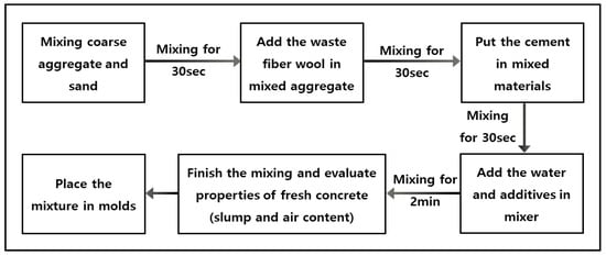 The mixing of concrete with added waste fiber wool for specimen preparation was conducted using a forced mixer, following the sequence depicted in Figure 4.